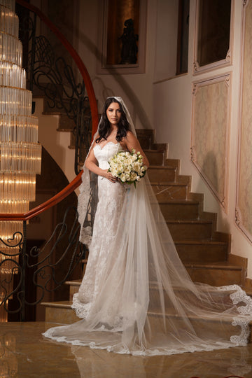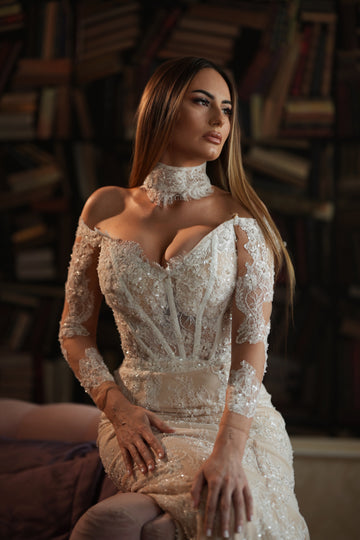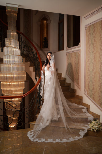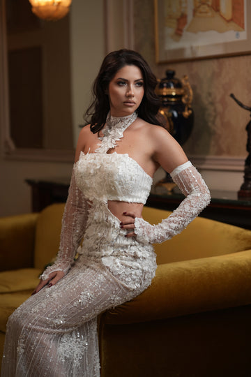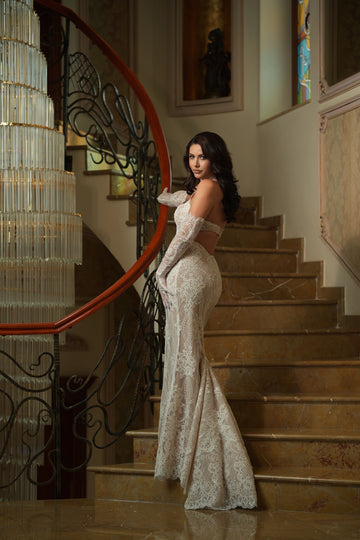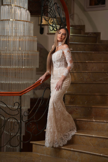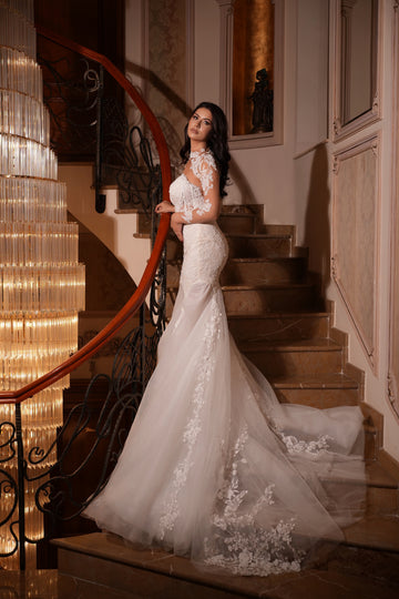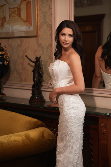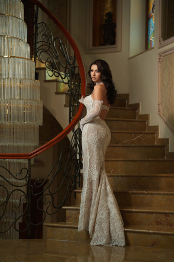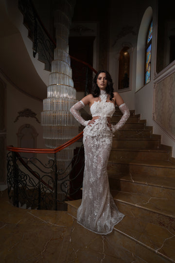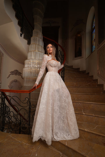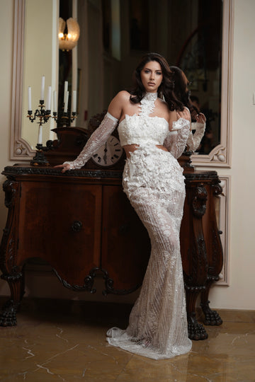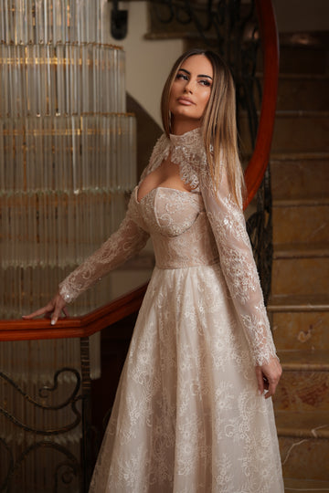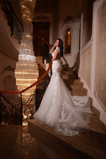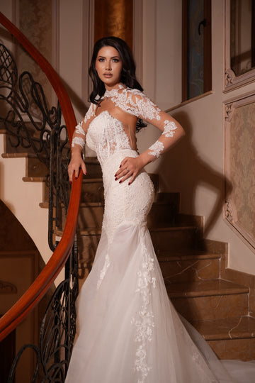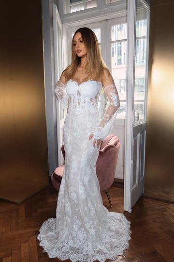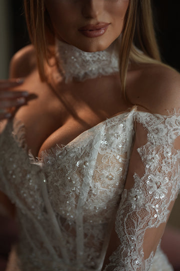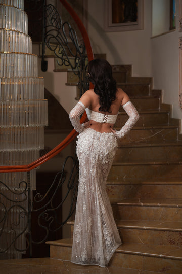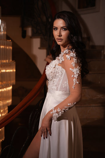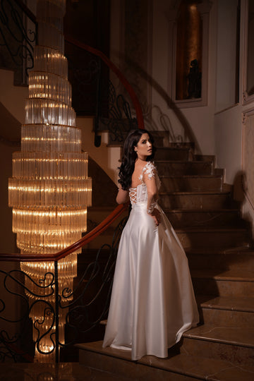 Partea superioară a rochiei este decorată cu inserții de dantelă florală 3D, care se întind delicat pe bust. Acest mic detaliu adaugă un accent romantic și sofisticat, subliniind frumusețea și feminitatea miresei.
