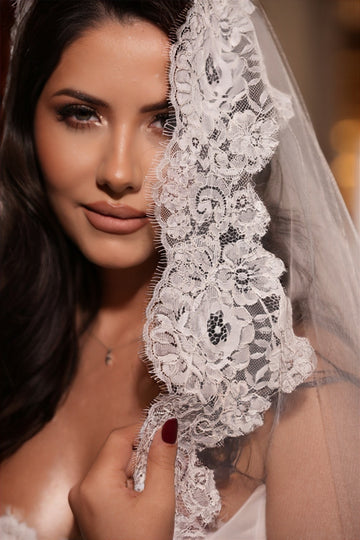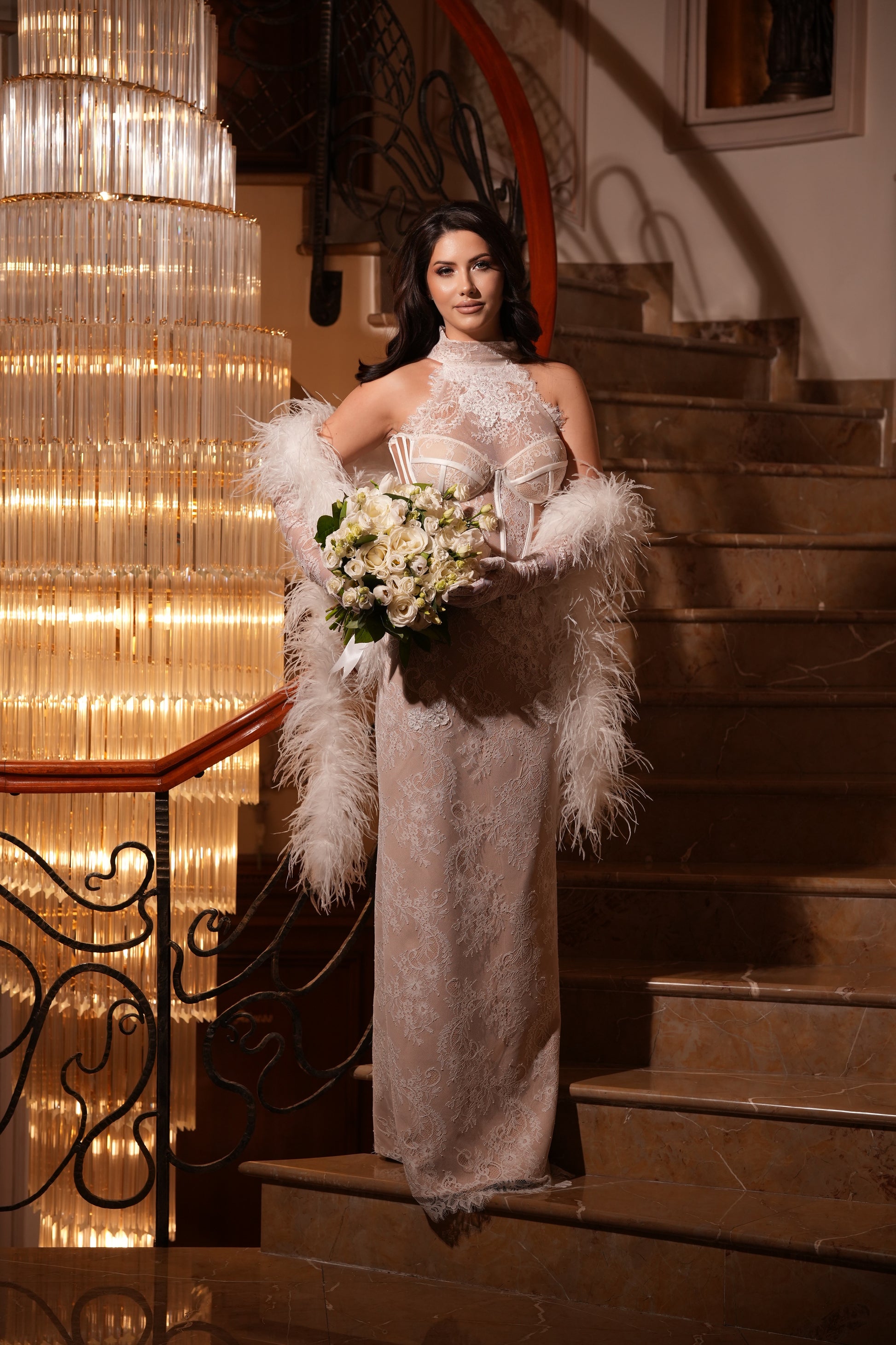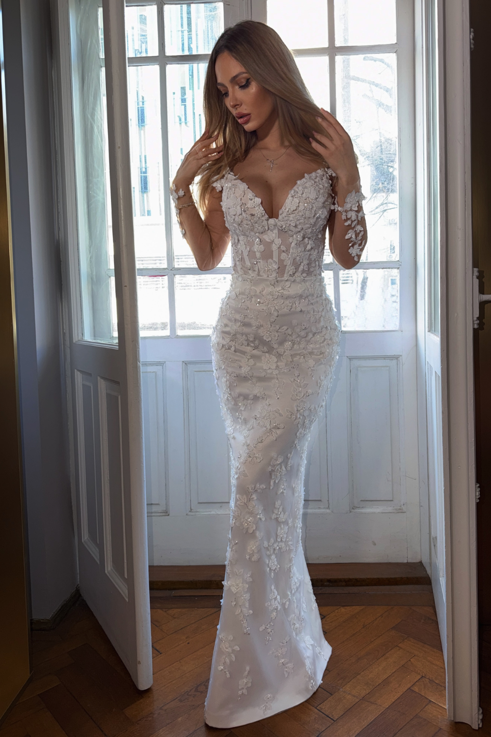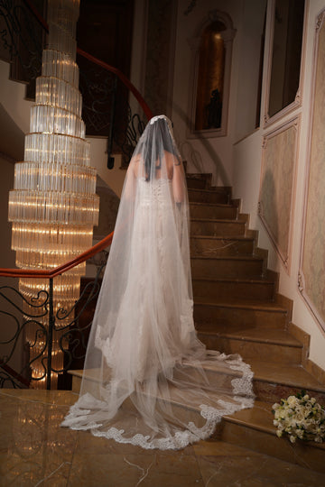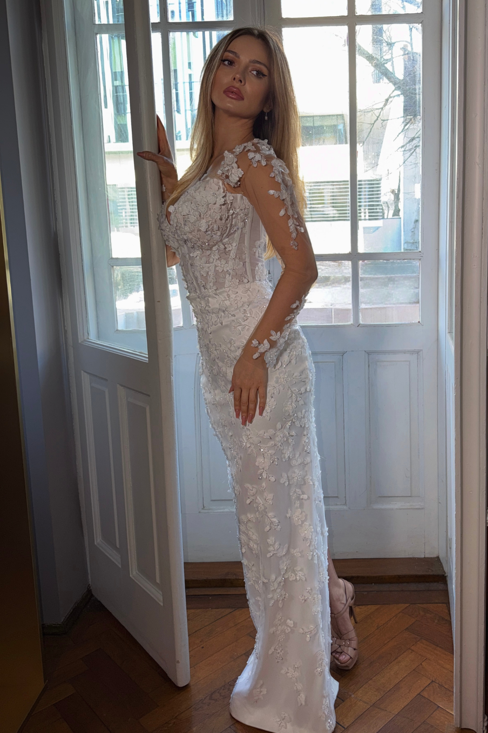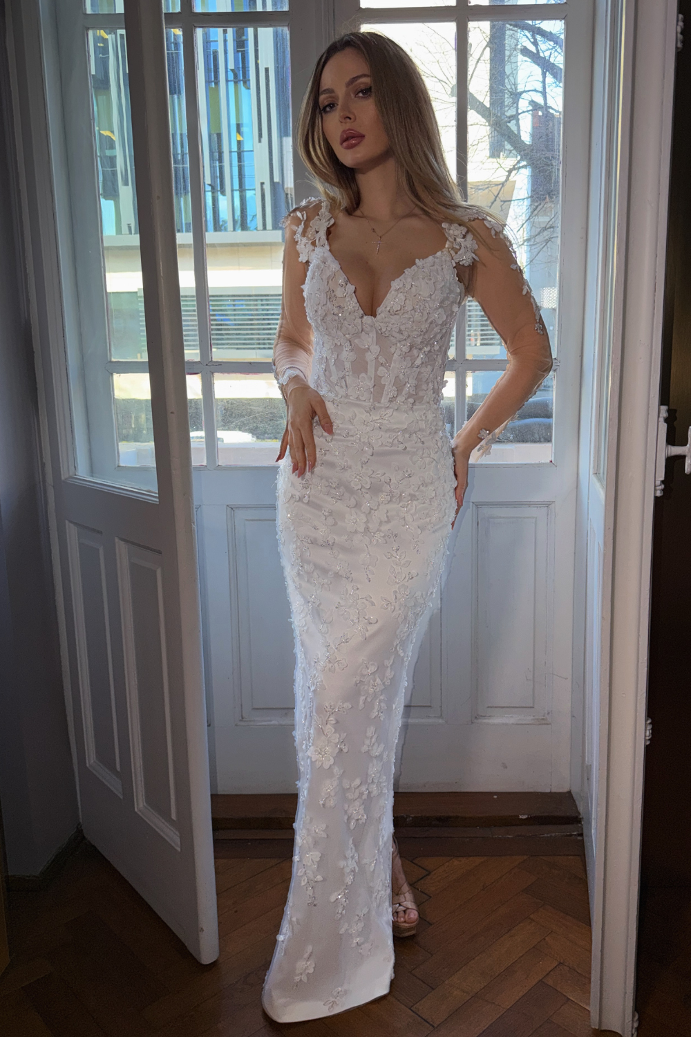 Partea superioară a rochiei este decorată cu inserții de dantelă florală 3D, care se întind delicat pe bust. Acest mic detaliu adaugă un accent romantic și sofisticat, subliniind frumusețea și feminitatea miresei.
