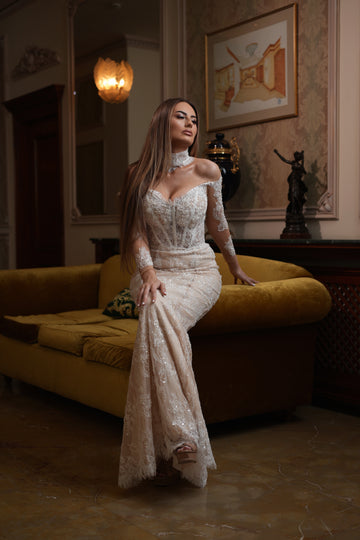 Rochia Bonnie este atât de spectaculoasă încât te vei simți fie tot parcursul purtării feminină și sexy. Rochia se poate achiziționa atât fără mânecile detașabile, cât și cu mâneci din material sau din material accesorizat cu pene.