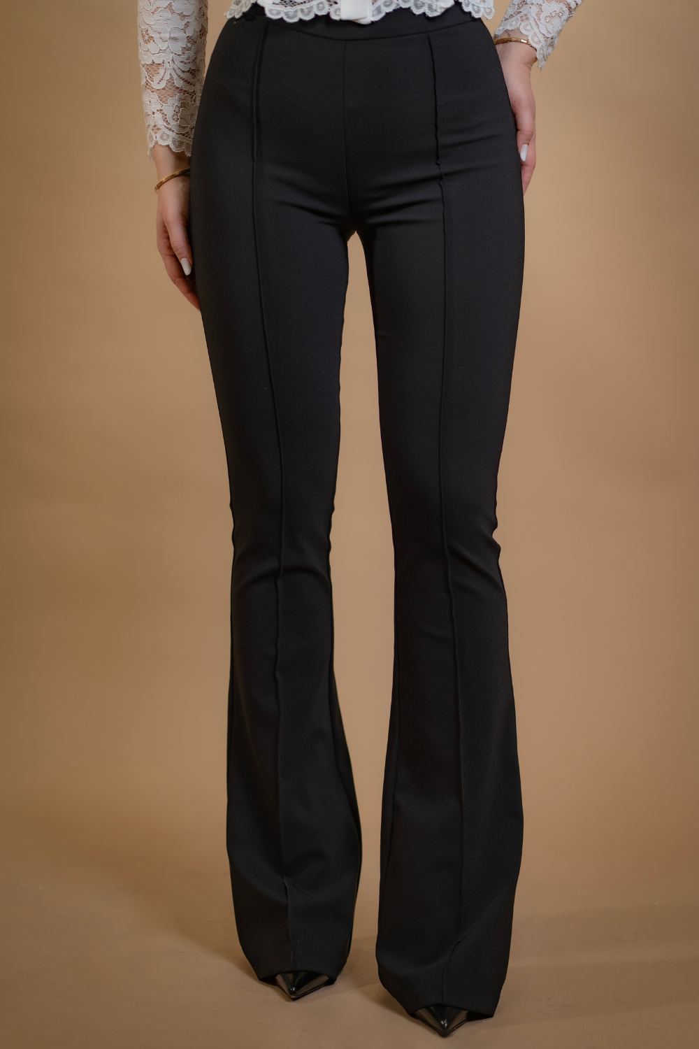 Pantalonii negri cu croială ușor evazată sunt o piesă versatilă și esențială în orice garderobă. Realizați dintr-un material de calitate superioară, aceștia oferă un fit confortabil și elegant. Talia înaltă accentuează silueta, iar designul minimalist îi face potriviți atât pentru birou, cât și pentru evenimente formale. Se pot asorta cu bluze elegante sau sacouri structurate pentru un look complet.