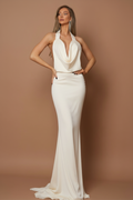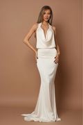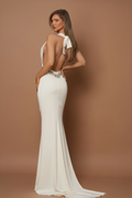 Rochie elegantă din material satinat alb, cu spatele gol, accesorizată cu detalii strălucitoare în talie. Designul sofisticat și croiala fluidă oferă un aer rafinat și seducător, ideal pentru evenimentul tău special.