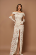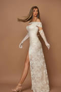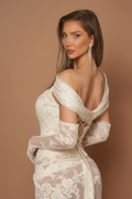 Rochia Divine spectaculoasă emană eleganță și rafinament, fiind alegerea perfectă pentru ocazii deosebite la cununie sau nuntă. Realizată dintr-o dantelă fină, cu un design floral sofisticat, rochia îmbină transparența senzuală cu detalii luxuriante. Croiala sa impecabilă include un decolteu tip bardot, care evidențiază grațios linia umerilor, și o fustă lungă cu un crăpătură îndrăzneață, ce adaugă un aer seducător. Crăpătura se poate ajusta în funcție de specificațiile fiecărei cliente,