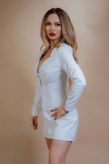 O rochie mini cu aer de sacou, croită dintr-un material structurat, neelastic, care se potrivește perfect pentru ocazii elegante, petreceri, întâlniri importante sau evenimente de zi într-un stil elegant sau chiar pentru cununie. Designul inspirat de sacou aduce o notă contemporană și sofisticată, iar linia curată pune în valoare talia și umerii, creând o siluetă armonioasă, dar bine definită. Materialul ferm oferă un aspect impecabil pe parcursul întregii zile, iar nuanța deschisă, delicată, se combină ușor cu accesorii aurii, perle sau nuanțe nude. Nasturii sunt strict de design.