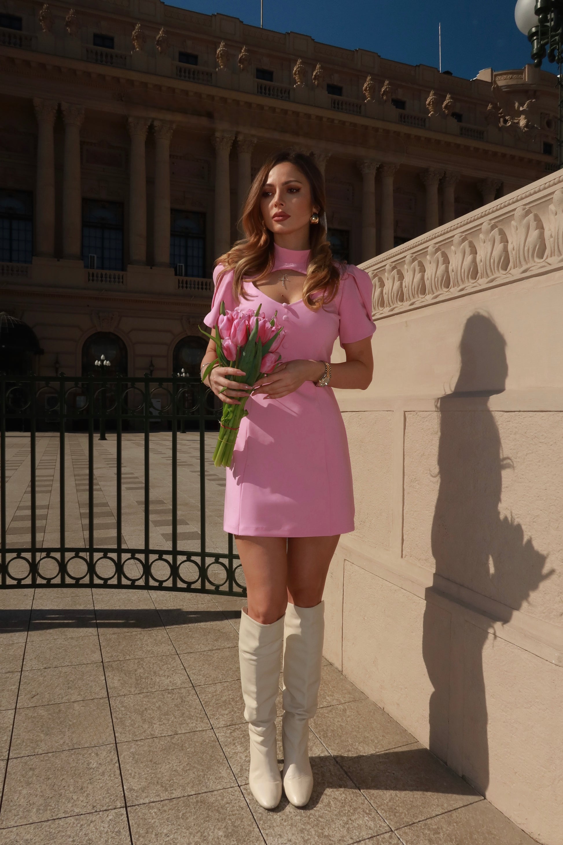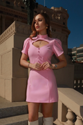 Mâneca de tip lalea oferă rochiei o eleganță rafinată inspirată din moda anilor 60 da cu tendințe actuale. Pentru un plus de eleganță nasturii decorativi evidențiază linia armonioasă a corpului, iar decolteul oferă un aer romantic.