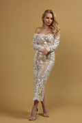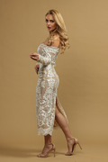 Rochia este realizată din broderie de dantelă și are cupe integrate.