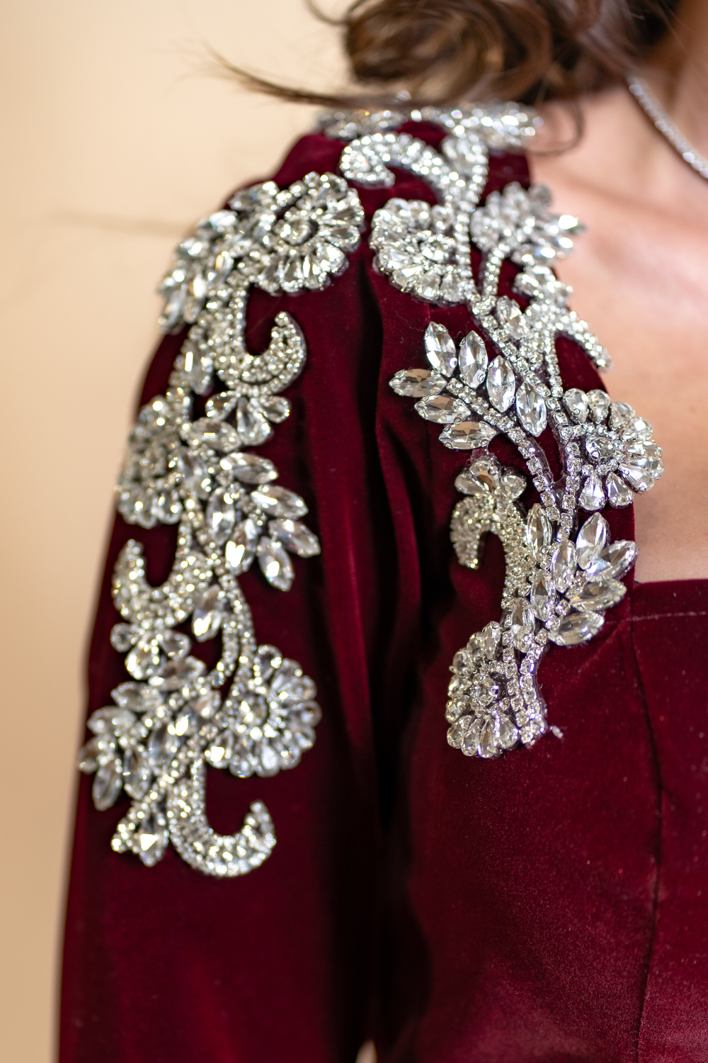 Adaugă un plus de rafinament garderobei tale cu această rochie elegantă din catifea burgundy, creată pentru femeile care iubesc stilul sofisticat și materialele luxoase. Realizată din catifea duchesse, cu un croi feminin ce urmărește linia corpului, rochia se remarcă prin decolteul pătrat și aplicațiile decorative cu cristale plasate pe umeri, oferind un efect spectaculos și rafinat.