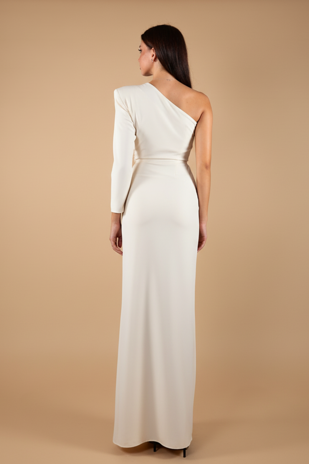 Această rochie lungă elegantă, cu o croială sofisticată, este perfectă pentru o cununie sau un alt eveniment special. Confecționată dintr-un material premium, rochia se așază armonios pe siluetă, accentuând formele feminine. Crăpătura pe picior adaugă un strop de mister și fantezie, oferind totodată un look modern și trendy. În talie, rochia este delicat accesorizată cu pietre. Această piesă vestimentară va transforma orice apariție într-una memorabilă, aducând o notă de rafinament la fiecare pas.