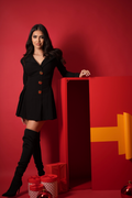 Croiala rochie Lena cu pliuri laterale delicate, adaugă fluiditate și mișcare, în timp ce nasturii aurii mari devin punctul de atracție, conferind un aer de opulență subtilă. Mânecile, perfect structurate, adaugă un plus de rafinament, iar combinația dintre elementele clasice și detaliile moderne transformă rochia într-o piesă versatilă, ideală pentru serile de cocktail sau evenimentele sofisticate.