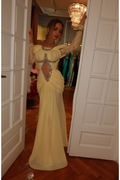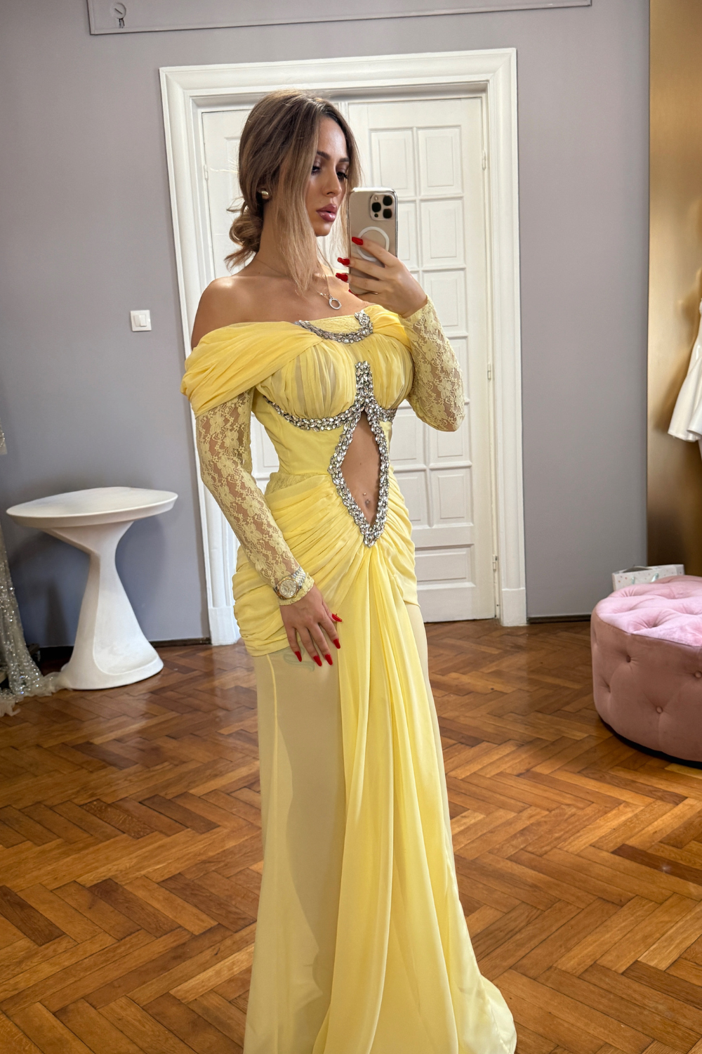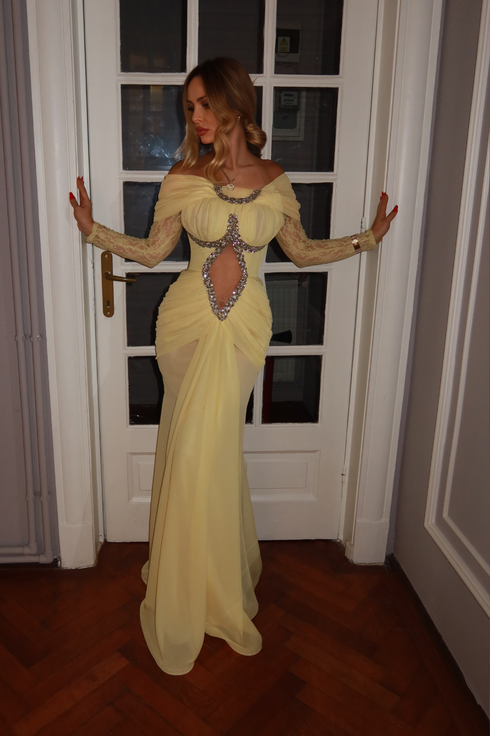 Rochie lunga galben pastel din voal si dantela, accesorizata cu cristale