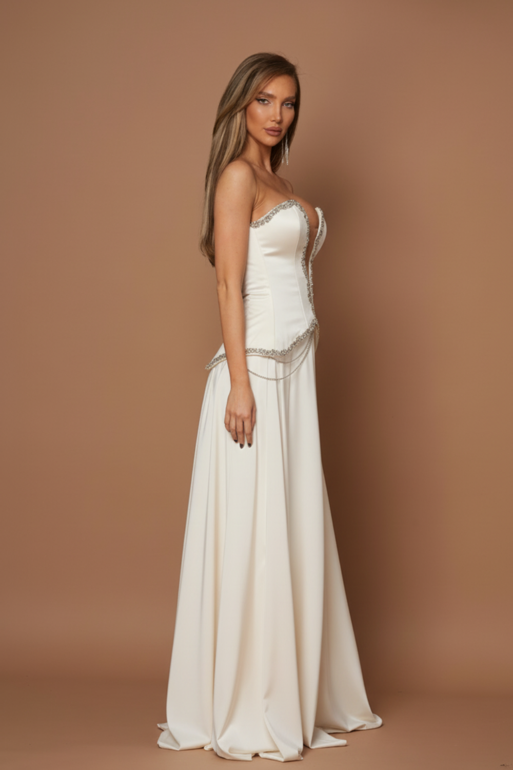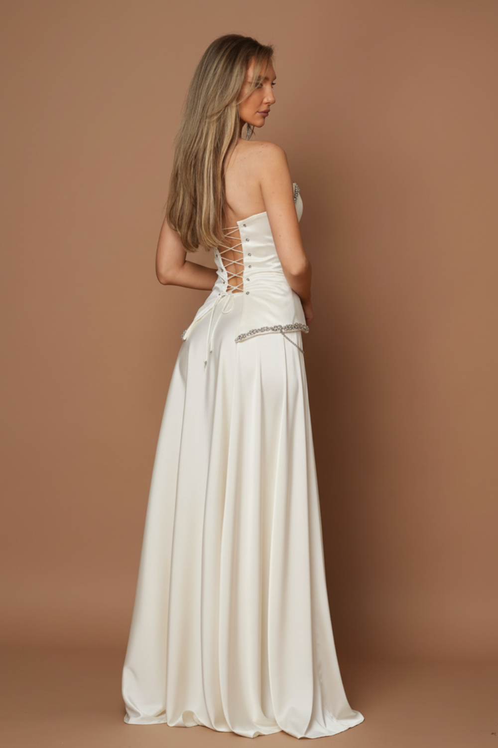 Rochia de seară Moonlit este realizată din două piese, dintr-un material satinat alb ce îmbrățișează silueta cu eleganță și rafinament. Bustul corsetat, cu un decolteu adânc în formă de inimă, este îmbogățit cu aplicații prețioase din cristale și lanțuri fine argintii, conturând un design seducător și opulent. Talia este subtil accentuată, iar fusta fluidă, cu un slit îndrăzneț, adaugă o notă de senzualitate și dinamism. Perfectă pentru cununie sau nuntă.