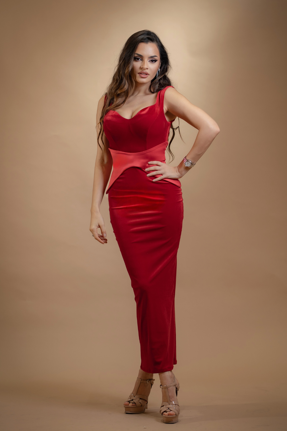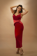 O interpretare modernă a eleganței clasice, această rochie lungă roșie îmbină perfect linia corpului cu un design sculptural în zona taliei. Confecționată dintr-un material catifelat, rochia pune accent pe bust și pe siluetă, creând un contur impecabil și feminin. Inserțiile satinate din talie redefinesc proporțiile și adaugă un detaliu couture ce atrage privirea.