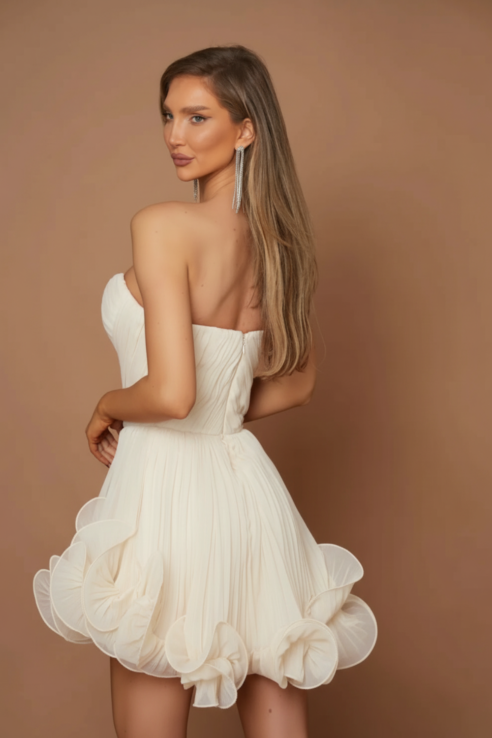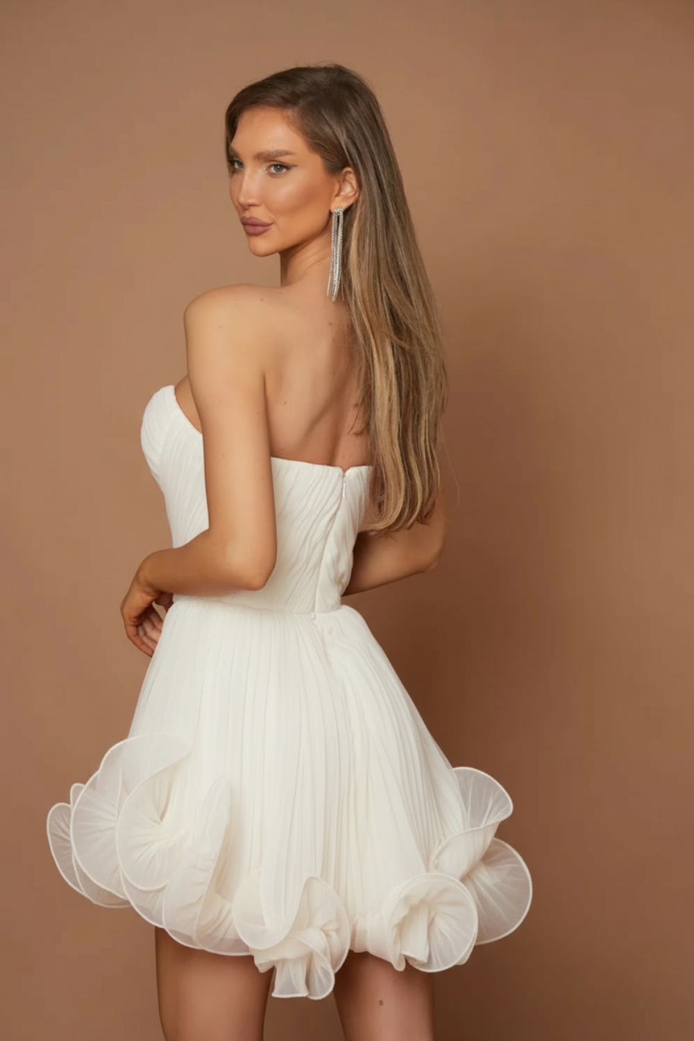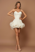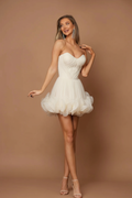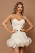 Rochia Zefir este definiția eleganței și a rafinamentului. Cu un design fără bretele și un corset ce subliniază delicat talia, această piesă emană feminitate și stil. Fusta mini este decorată cu detalii volumetrice deosebite, ce adaugă un aer sofisticat și dinamic întregului look. Realizată din materiale de înaltă calitate, această rochie este alegerea perfectă pentru cununie sau chiar nuntă, fie chiar și penru un eveniment important . Un adevărat simbol al luxului și al bunului gust!