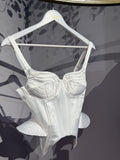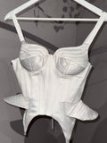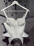 Croiala sculpturală evidențiază talia, iar detaliile laterale în stil peplum creează un efect de volum subtil, aducând un plus de dramatism și stil. Acest top este o alegere ideală pentru a fi purtat atât într-o ținută de seară sofisticată, cât și într-un look casual-chic.